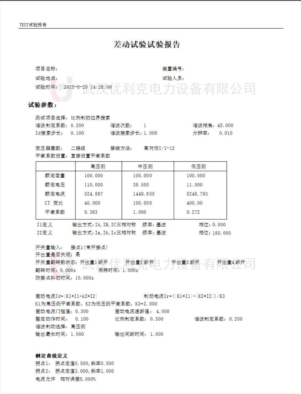 平衡系數(shù):根據(jù)CT變比和變壓器額定電流計(jì)算高低壓側(cè)的平衡系數(shù)(如高壓側(cè)Kh=1,低壓側(cè)Kl=0.795)。